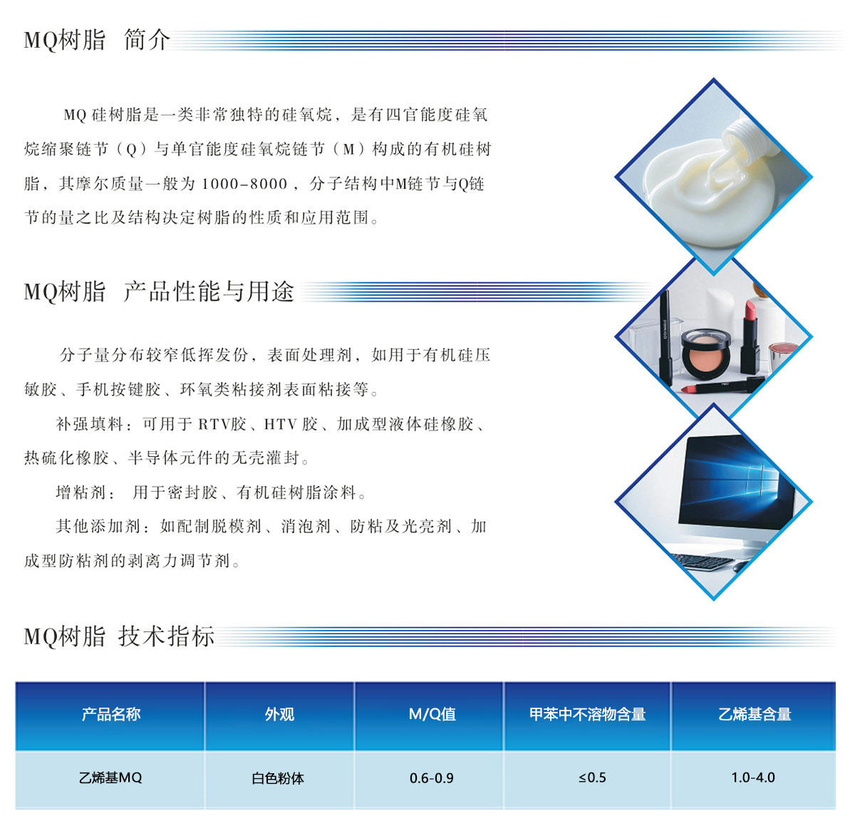 甲基MQ硅树脂是以Si-O键为骨架的三维球型有机硅高分子材料,由单官能度(M)和四官能度(Q)硅氧烷单元通过共水解-缩聚反应形成。其核心为高密度笼状二氧化硅,外层覆盖低密度甲基硅氧烷层,兼具无机材料的耐热性与有机材料的柔韧性,具有宽温域耐受性、高透光率、拒水性及电气绝缘性,广泛应用于电子封装、硅橡胶补强、光学材料等领域。